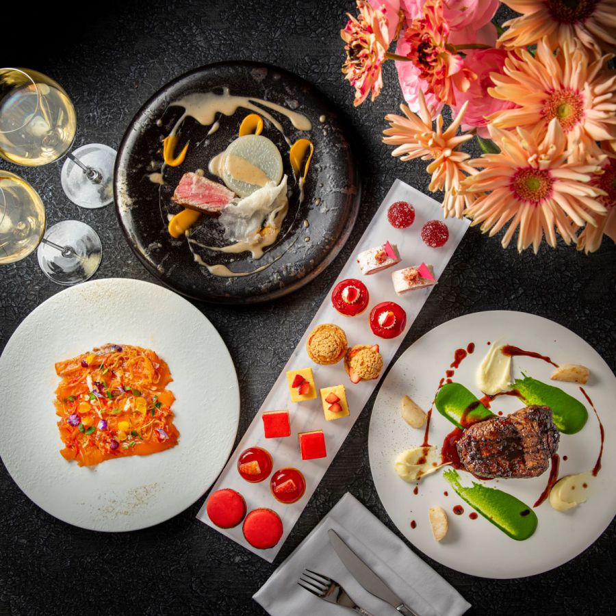 ジャスミンとマンダリンが香るミモザケーキ、桜香るベリーソースが入ったクリスタルフラワーがきらめく桜&ストロベリーのスウィリ、スミレとカシスが香る透明感あふれる甘酸っぱいゼリーのタルトなど、香りと食感のバランスにこだわった9種のスイーツが楽しめます。