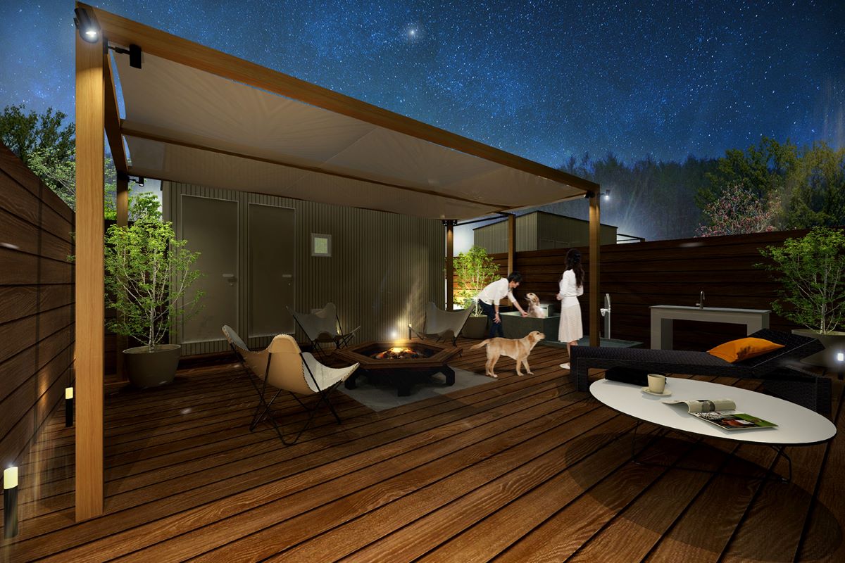 アウトドア初心者や女性でも安心して過ごせるよう、各棟に温泉露天風呂のほか、専用食事スペース、個別トイレを完備。