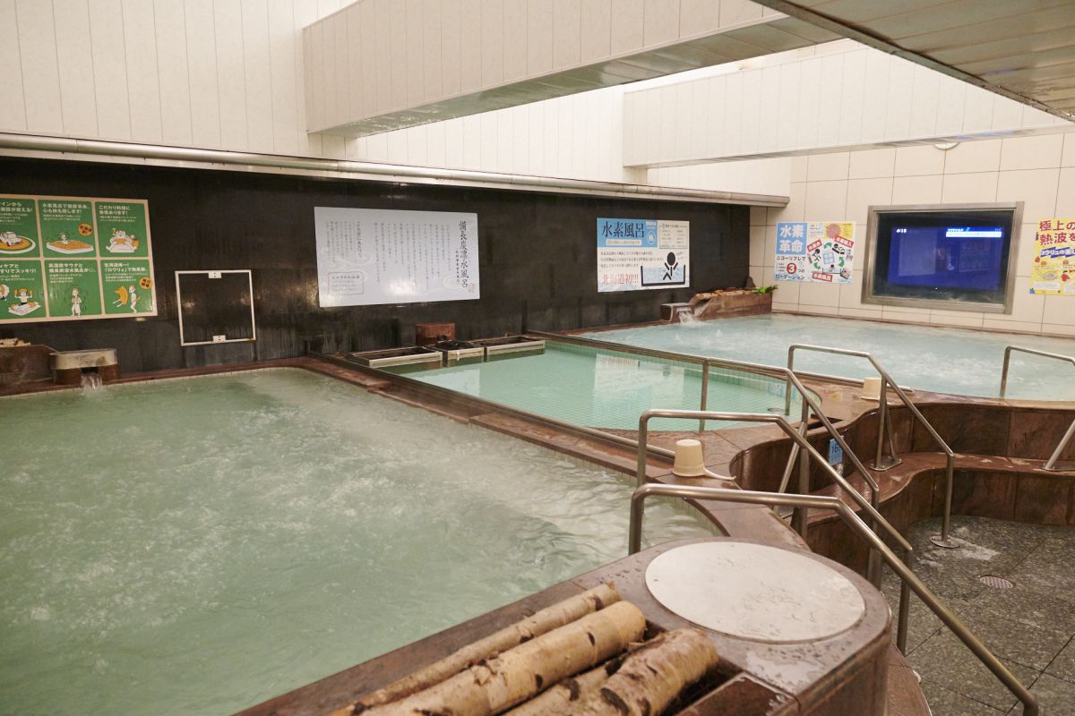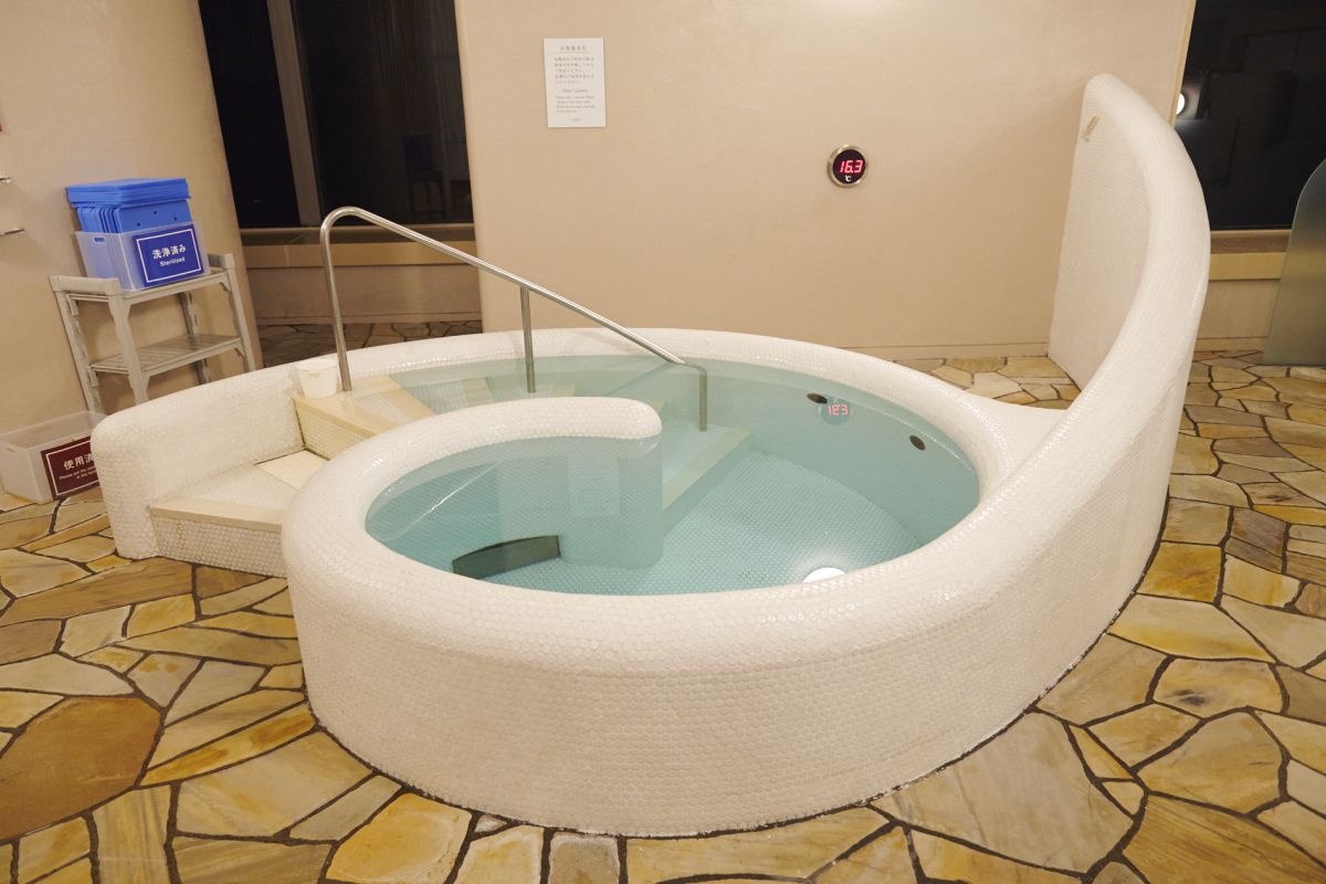 サウナ室だけでなく、水風呂もまた広々としています。16℃の水にはこだわりの備長炭が浸かっているので、汗孔がしっかりと引き締まるだけでなく、備長炭によるマイナスイオン効果が実感できるかも。左右には水素風呂と中温湯の浴槽が並び、浴場の中央にはジャグジー風呂も設置されています。