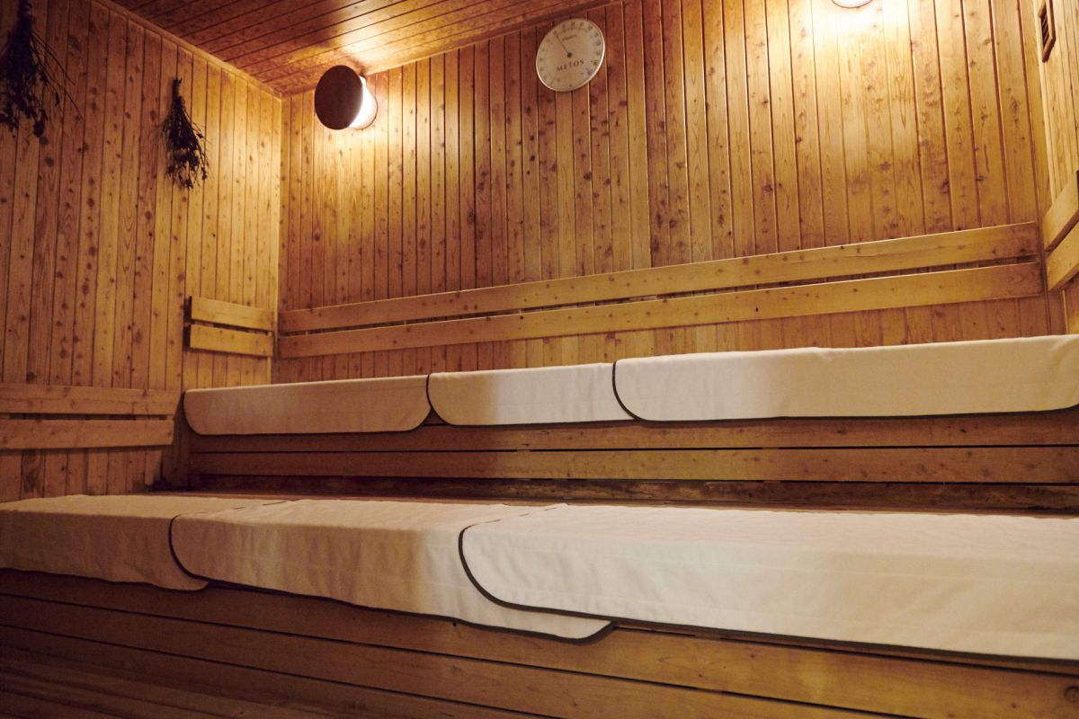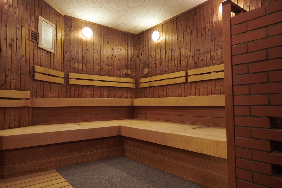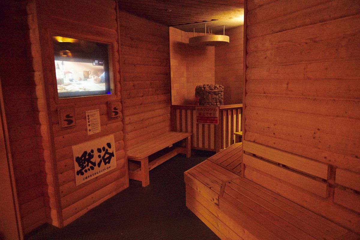 サウナ室の温度は男性スパが100℃、女性スパが90℃です。男女ともに2段ベンチでTVはなし。ロウリュ設備がなく、ヒリヒリと高温でドライな熱が楽しめます。