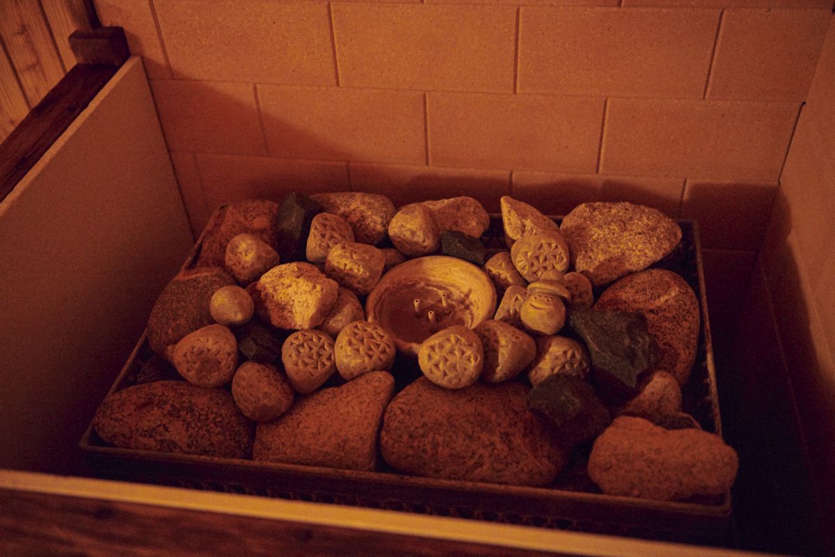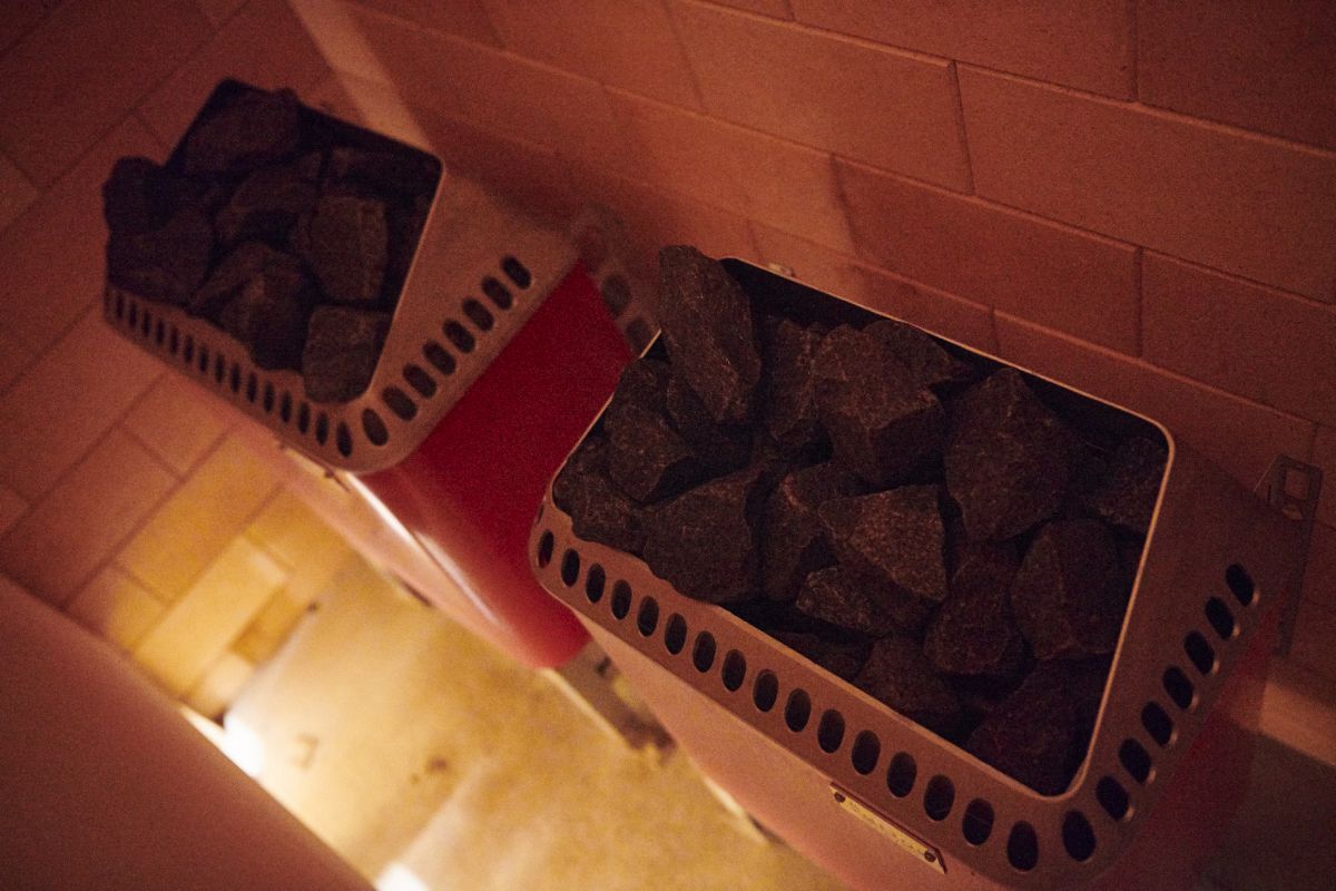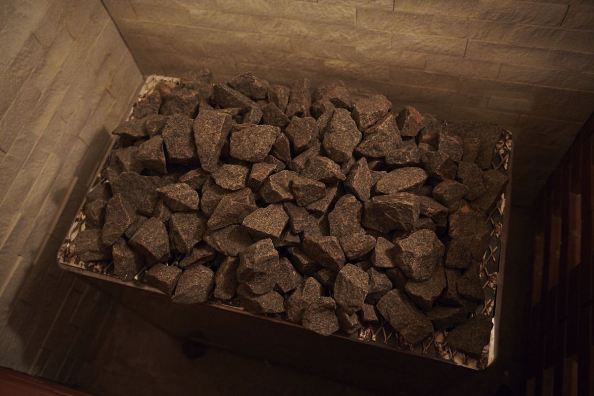 収容人数30名の広々としたサウナ室では、ロッキー山脈のように高くそびえるロッキーサウナが鎮座しています。サウナストーンがぎっしりと積み上げられた巨大サウナストーブは約80℃。輻射熱のパワーがたまりません!