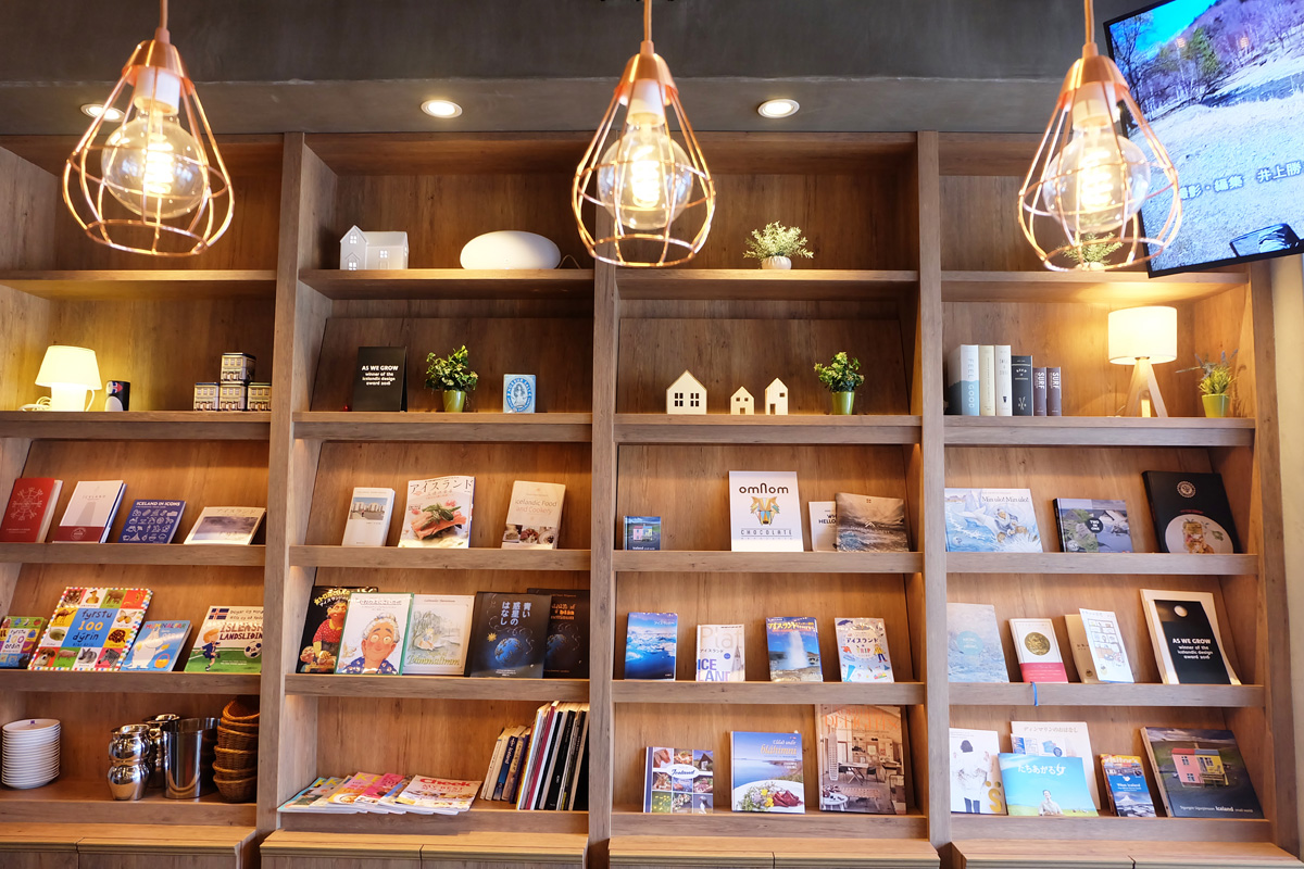 扉を開けると目に飛び込んでくるのが大きな本棚。こちらにはアイスランドに関連する本や絵本、北欧の本などがズラリと並んでいます。