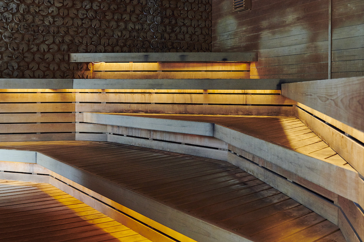 「洞爺湖万世閣 ホテルレイクサイドテラス」には、「月の湯」と「星の湯」というふたつの大浴場があります。男女入替制なので、男性宿泊客は到着日が「月の湯」、翌日が「星の湯」となり、1泊で2種類のサウナが体験可能。とくに見逃せないのが、サウナや造園のスペシャリスト監修のもと、2019年にリニューアルを果たした「月の湯」のサウナです。国産ヒノキの温もりが感じられる空間で、4段ベンチはデザイン性が抜群!