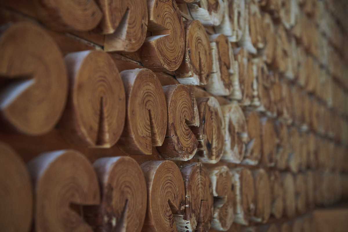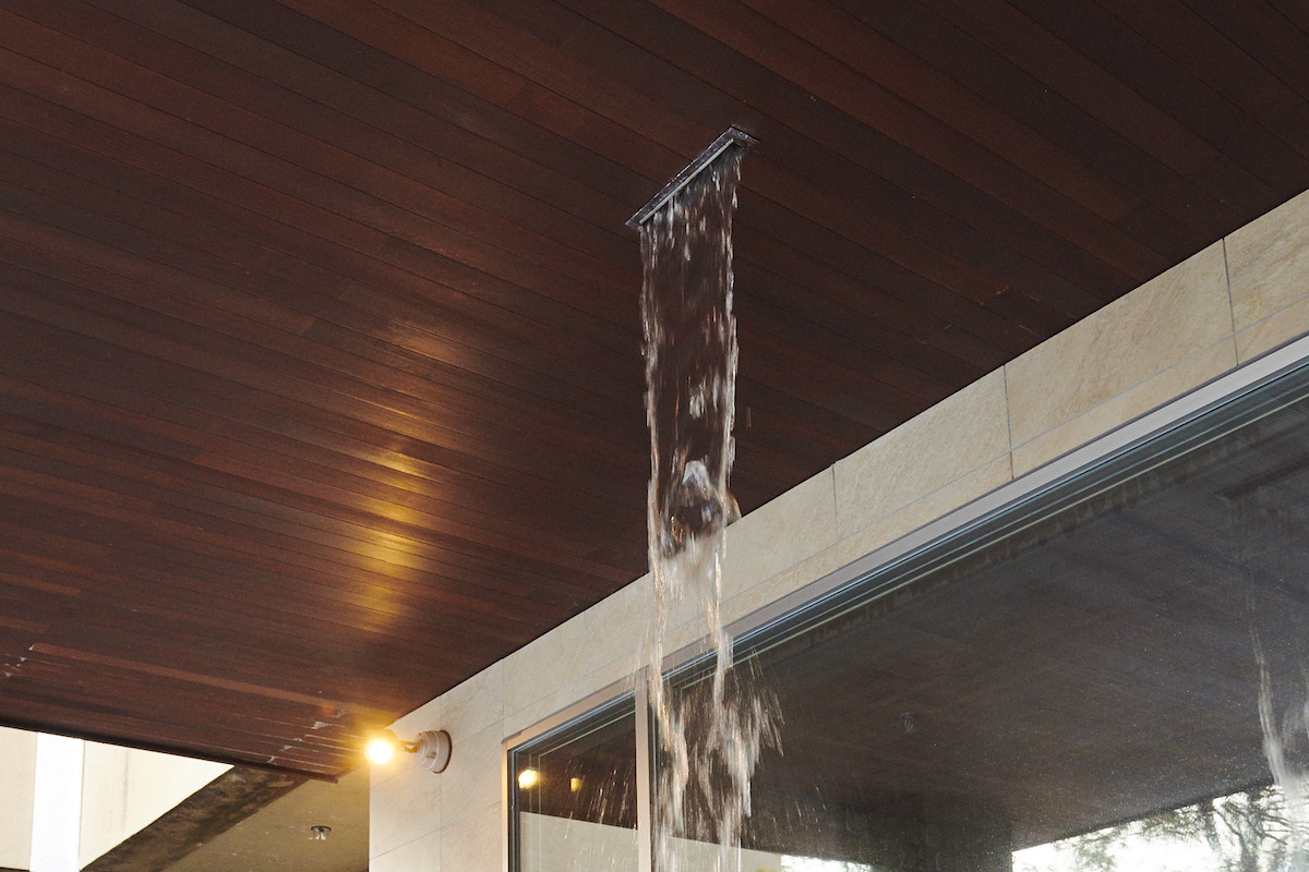 オートの水は壁面にも流れます。国産ヒノキが豊かに香り、壁(ウォール)にオートロウリュがなされる「ウォーリュ」のスタイルに!