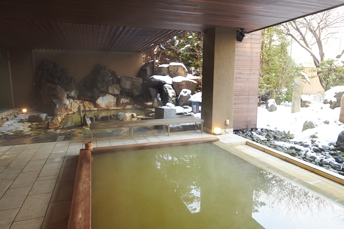 水風呂は露天スペースにあり、そのままベンチに腰を下ろして外気浴ができます。露天風呂の浴槽も2種類あるので、美しい巨石の庭の眺めとともに楽しみましょう。