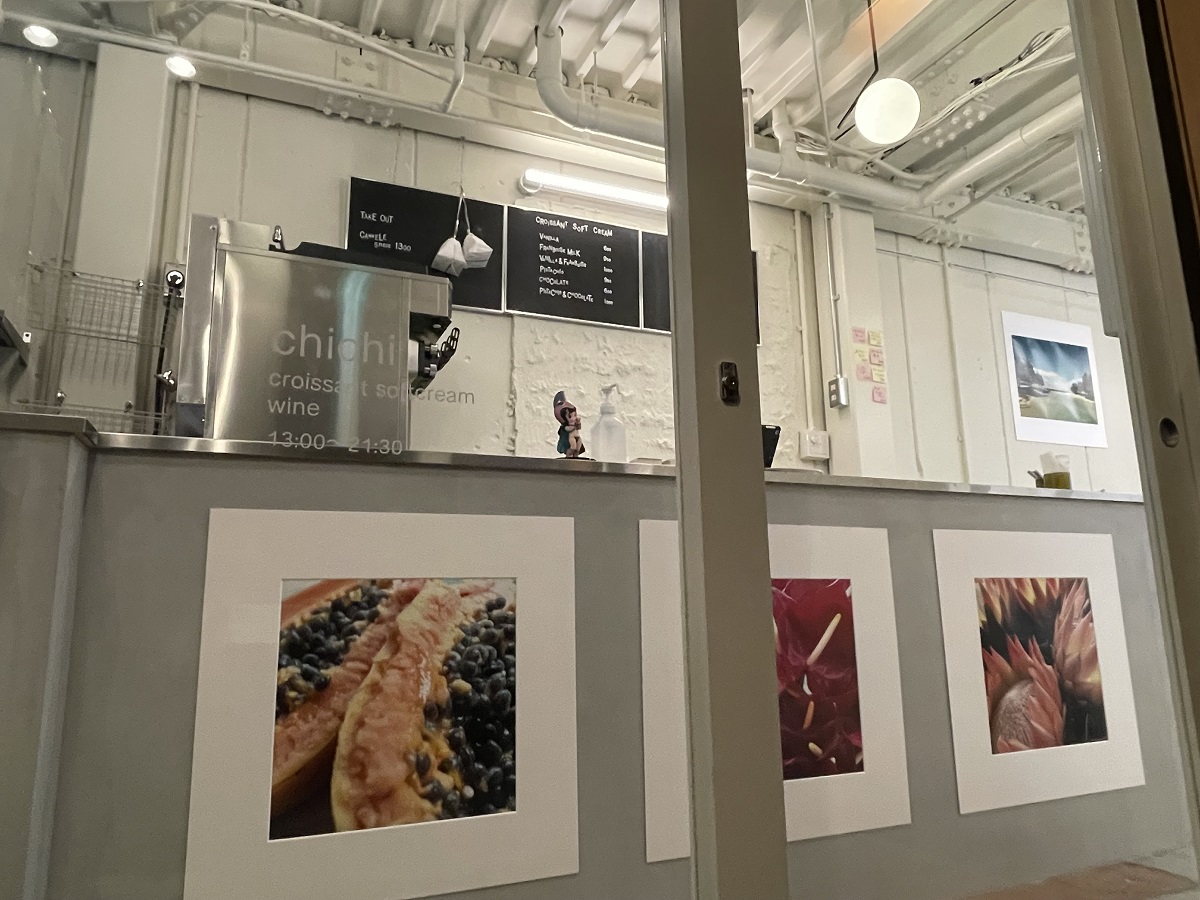 気候のよい時期は、スツールを持ってベランダに出て、ひなたぼっこをしながらソフトクリームを食べたり、ワインを飲んだりするのもおすすめ。イートインスペースはギャラリー利用もされているので、その時々で写真や絵などさまざまなアート作品の展示とも出合えます。