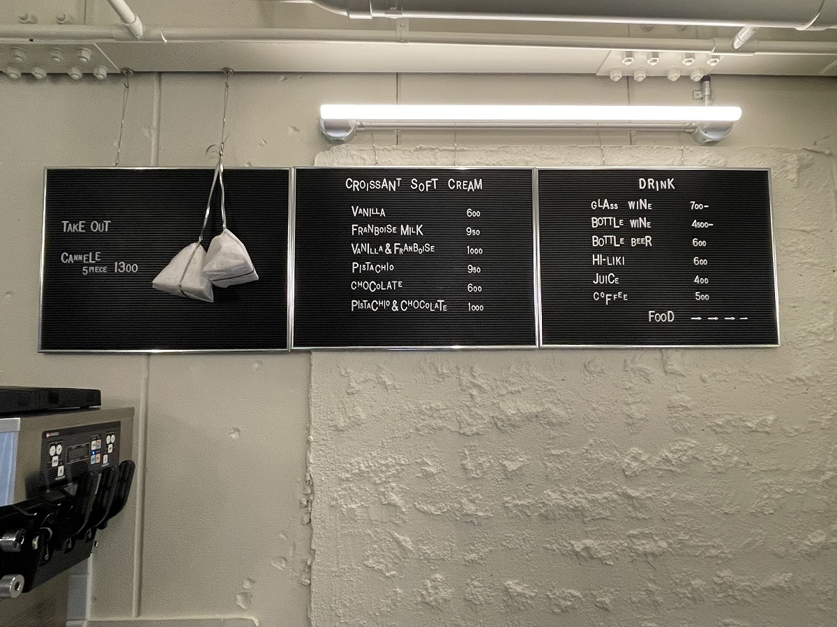 メニューボードには、クロワッサンソフトクリームと、ドリンク、テイクアウトのメニューが書かれています。英語ですが大丈夫! ちゃんと説明してもらえます。