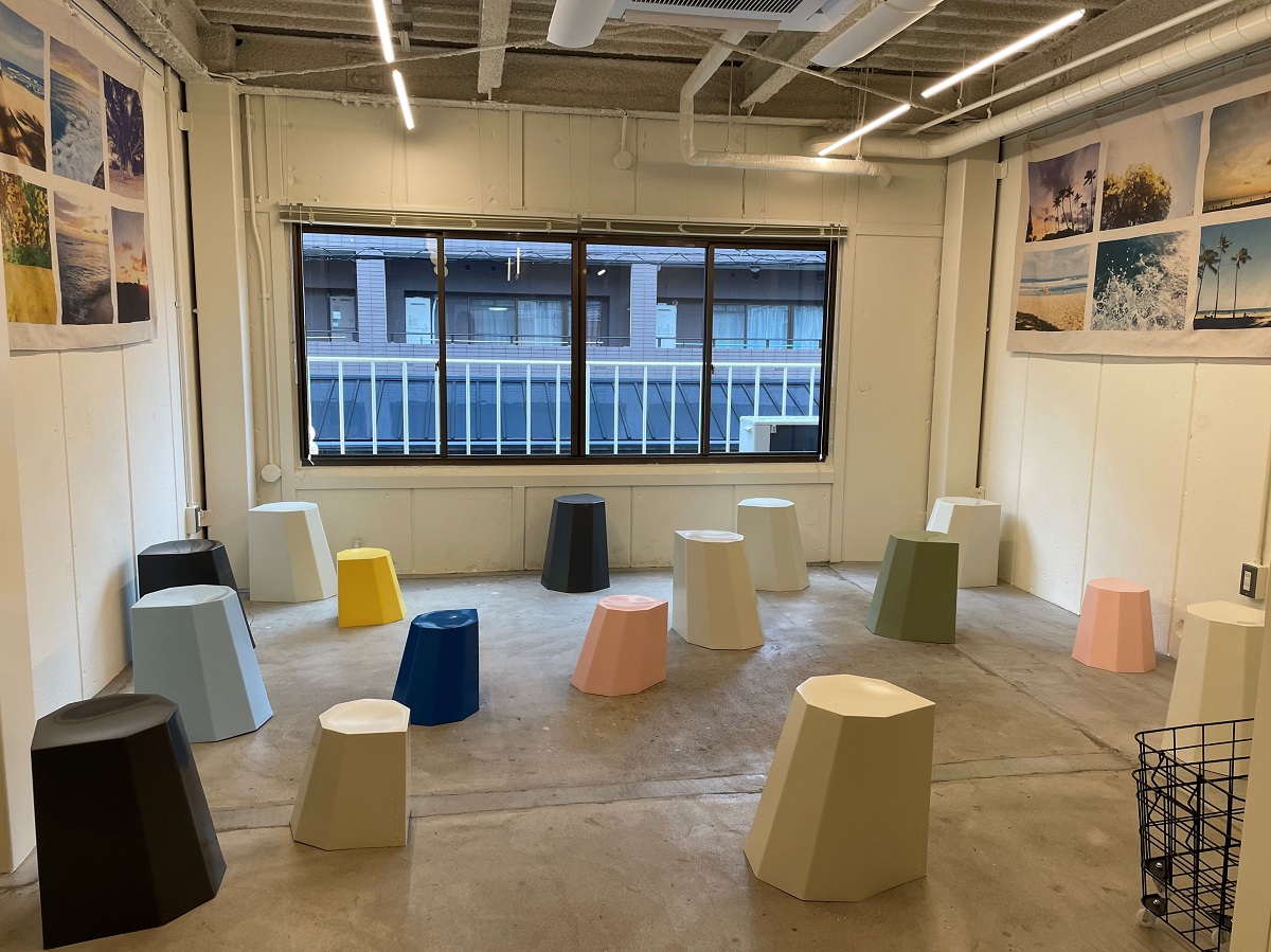 カウンター奥のイートインスペースは、とてもキュート。並んでいる色とりどりのかわいい多面体スツールは、イタリア人デザイナーによる「アーノルドサーカススツール」。大きさもいろいろで、どのスツールに座ろうかと悩むのも楽しい時間です。