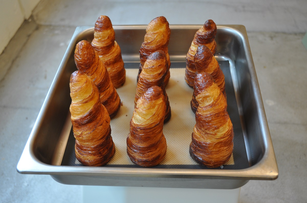 気になるコーンは、バターをたっぷり使った、香ばしくて甘さひかえめのクロワッサンを使用。特注の型に生地を円錐型に巻いて、毎日店内で焼いています。ひとつひとつ少しずつ形が違うのが、「我が子みたいでかわいい」とオーナーの田口さん。食べるときにクロワッサンの皮がぼろぼろとこぼれますが、こぼさずに食べようなんて思わず、スペインのバル風に、床に落としながら食べるのが正しい作法です。