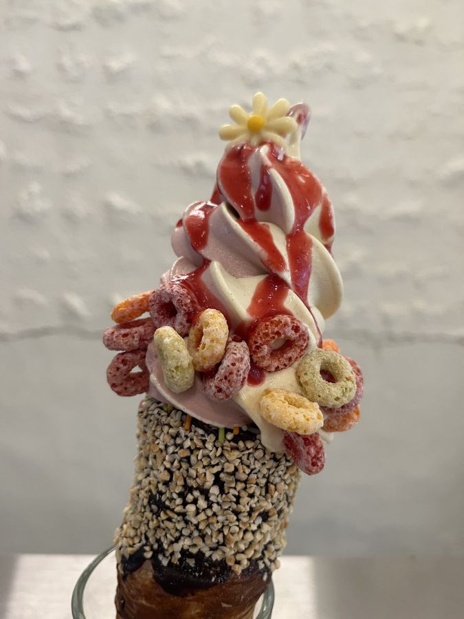 こちらは、定番のバニラとフランボワーズをミックスした「バニラ&フランボワーズ」(1000円)。側面にリングパフ、上にフランボワーズシロップ、花チョコをトッピング。クロワッサンのコーンにもチョコレートやアーモンドがコーティングされていて、見ているだけでうれしくなってきます。
