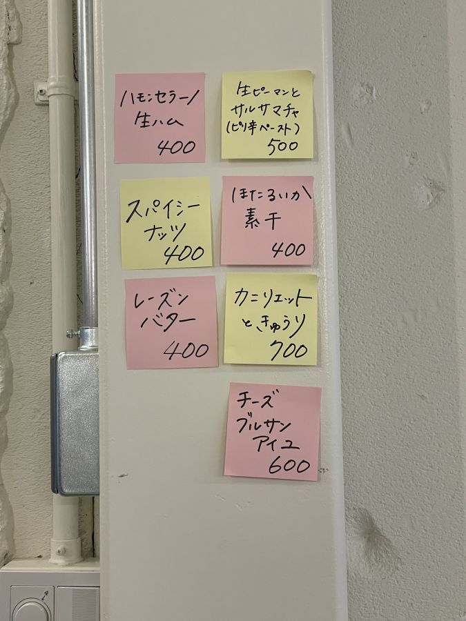 その日のおつまみのメニューは、付箋に書かれて壁に貼られています。