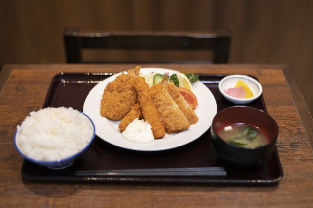 「わんさフライ定食」(100園)は、大ぶりのエビフライ2本にハムカツ、コロッケと、“わんさ”か盛られることから名付けられたボリュームたっぷりのメニュー。この量でこの値段、コストパフォーマンスも秀逸です。