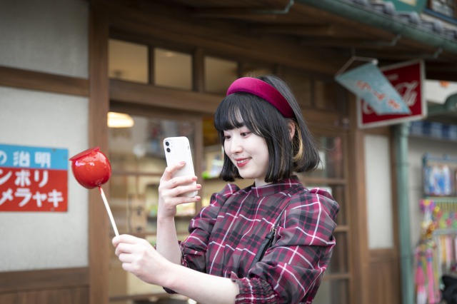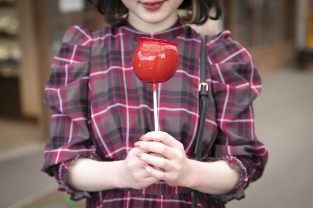 食べ歩きできるスイーツにもご注目! 大人も子どもも楽しめる駄菓子店「駄菓子 夢見堂」で購入できる「アイスりんご飴」(40園)は、中にシャキシャキシャーベット状の冷凍リンゴが入った、暑い日におすすめのりんご飴です。