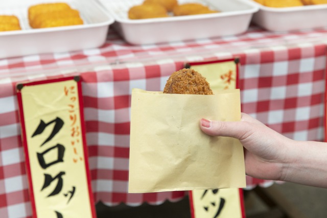 まずは商店街の精肉店「肉のおほみ」の、ホクホクのジャガイモと溢れる肉汁が魅力の「肉屋のクロケット」(30園)。高温のラードを使っているので脂っこくなく、細引きのパン粉の衣も薄めで、おやつ感覚で食べられます。