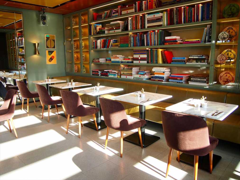 店内奥の扉を開けると、アートブックがずらりとセンスよく並べられた書斎風の空間もあります。メインダイニングに比べ、天井を低くすることで、親密感が増す雰囲気を演出しているとのこと。インテリアには少しカジュアルテイストが取り入れられ、女子会にも利用できそう。