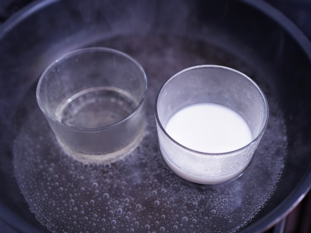 サラダ油と牛乳を60℃になるまで湯煎であたためます。