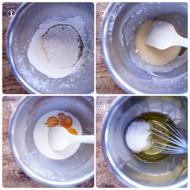①ボウルにサラダ油を入れ、薄力粉を再度ふるいながら入れます。