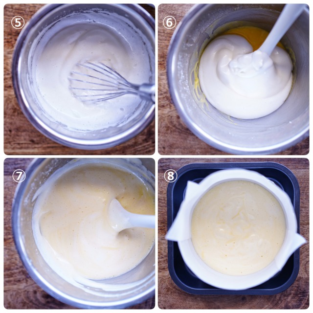 ⑤卵白はとろりと流れ落ちる程度(7分立て)にします。しっかり泡立てすぎるとカステラが割れる原因になります。