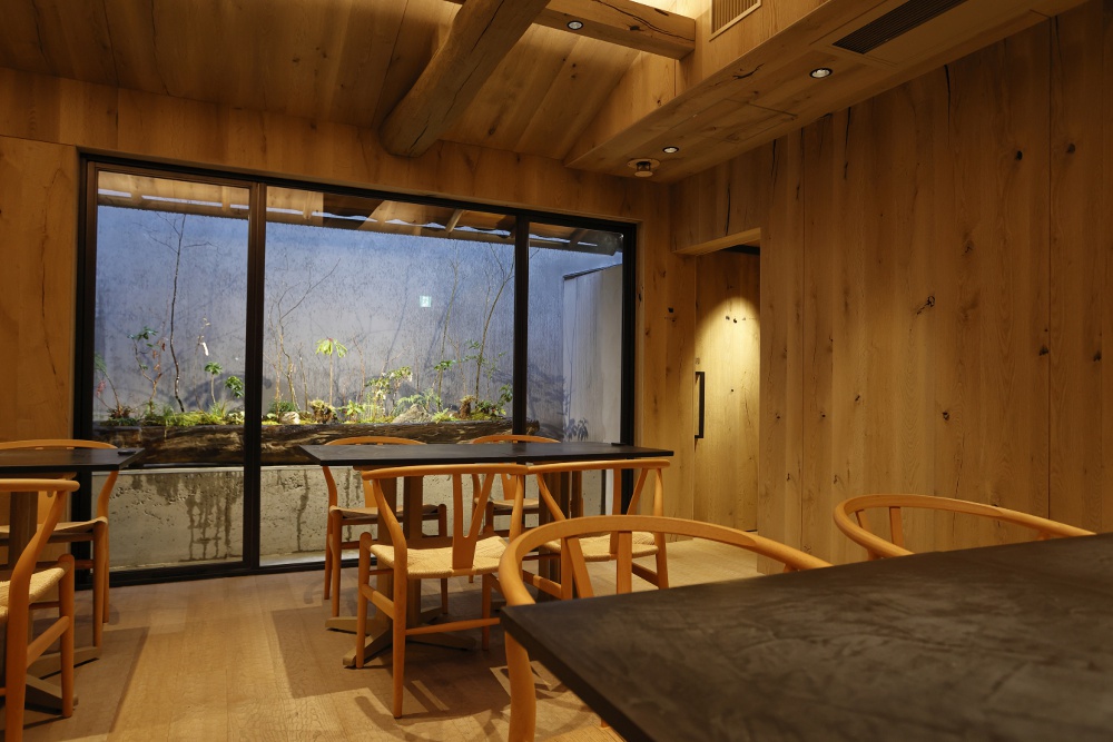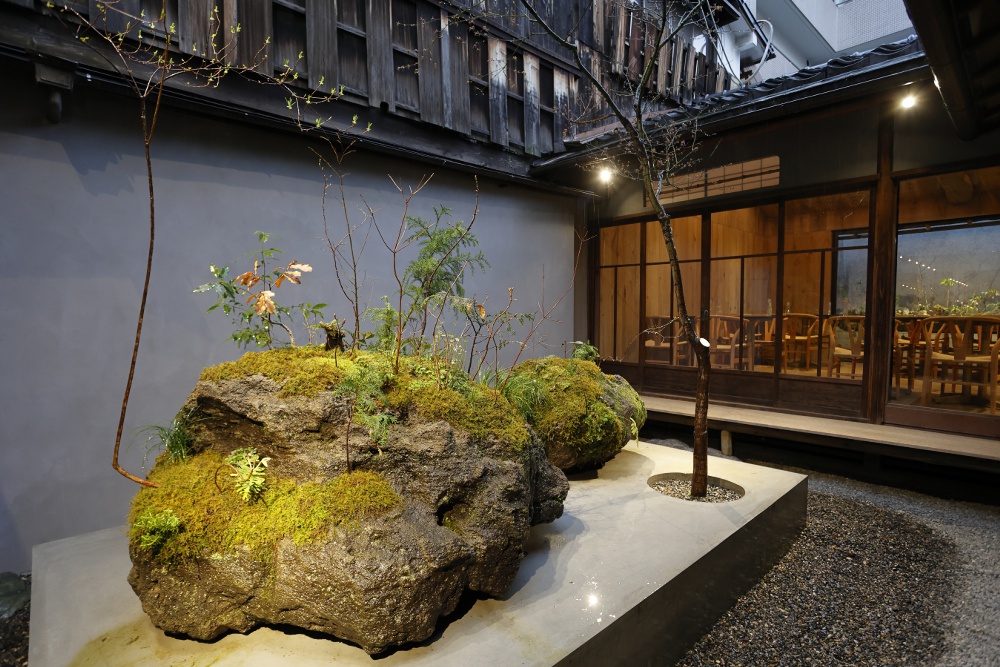 広々としたテーブル席の奥に坪庭があります。この庭を手がけたのは、東京のボタニカルアレンジメンツ「TSUBAKI」によって作られました。山に見立てた岩の上には、苔や約30種類の植物が植えられているそう! 四季折々の姿が楽しめます。