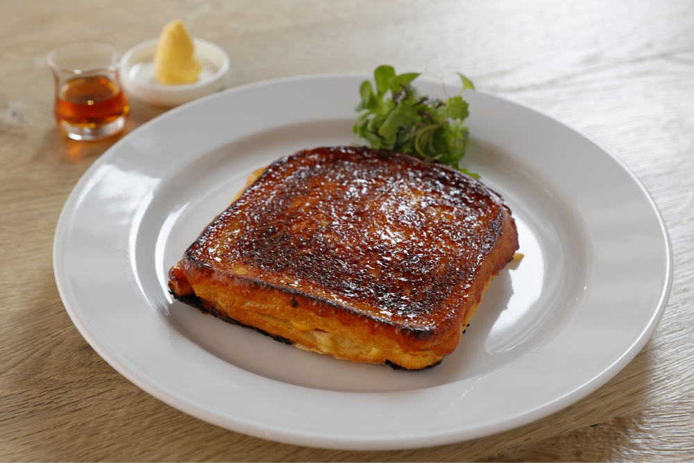 ハムチーズメルトフレンチトースト メープルシロップ添え1300円は、ランチの人気メニュー(11~15時)。キャラメリゼしたパンは、外はカリカリ、中はとろとろでやさしい甘さが特徴。具材は京都特産銘柄豚である京都ぽーくのボンレスハムと、チーズがサンドされていて、ボリューム満点です。添えられたメープルシロップをかけると、甘じょっぱい風味が口いっぱいに広がりますよ。