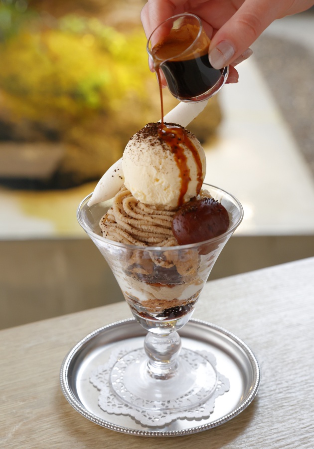 デザートのおすすめは、カフェタイム(15~20時)限定・珈琲モンブランパフェ1300円。タヒチ産バニラのジェラートやマロンクリーム、和栗の渋皮煮、コーヒーゼリーなどを合わせた、具だくさんな逸品です。サクサクのメレンゲや、ぷるぷるゼリーなどの食感も楽しい! 別添えのエスプレッソをかけて、味の変化も楽しんでみてください。