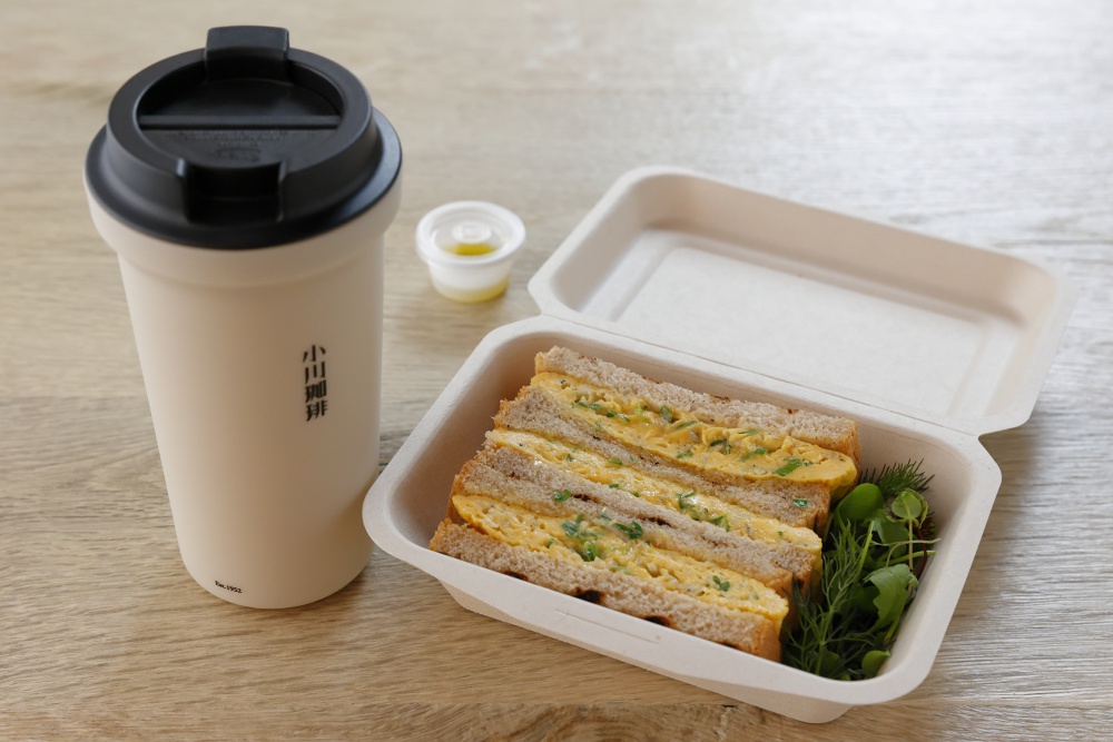 小川珈琲 堺町錦店では、テイクアウトができるメニューも揃います。九条ねぎとしらすの玉子サンドイッチ(TO GO)970円には、九条ねぎと、しらすがアクセントのふわふわの玉子焼きが挟まれています。オリーブオイルをかけていただくのもおすすめです。