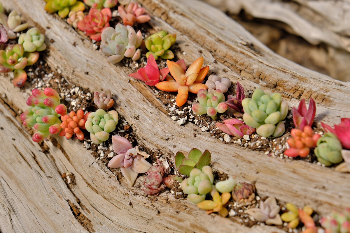粒々の正体が多肉植物。なんともかわいらしい多肉植物が、流木の溝にきれいに植えられています。