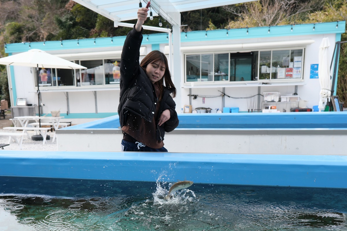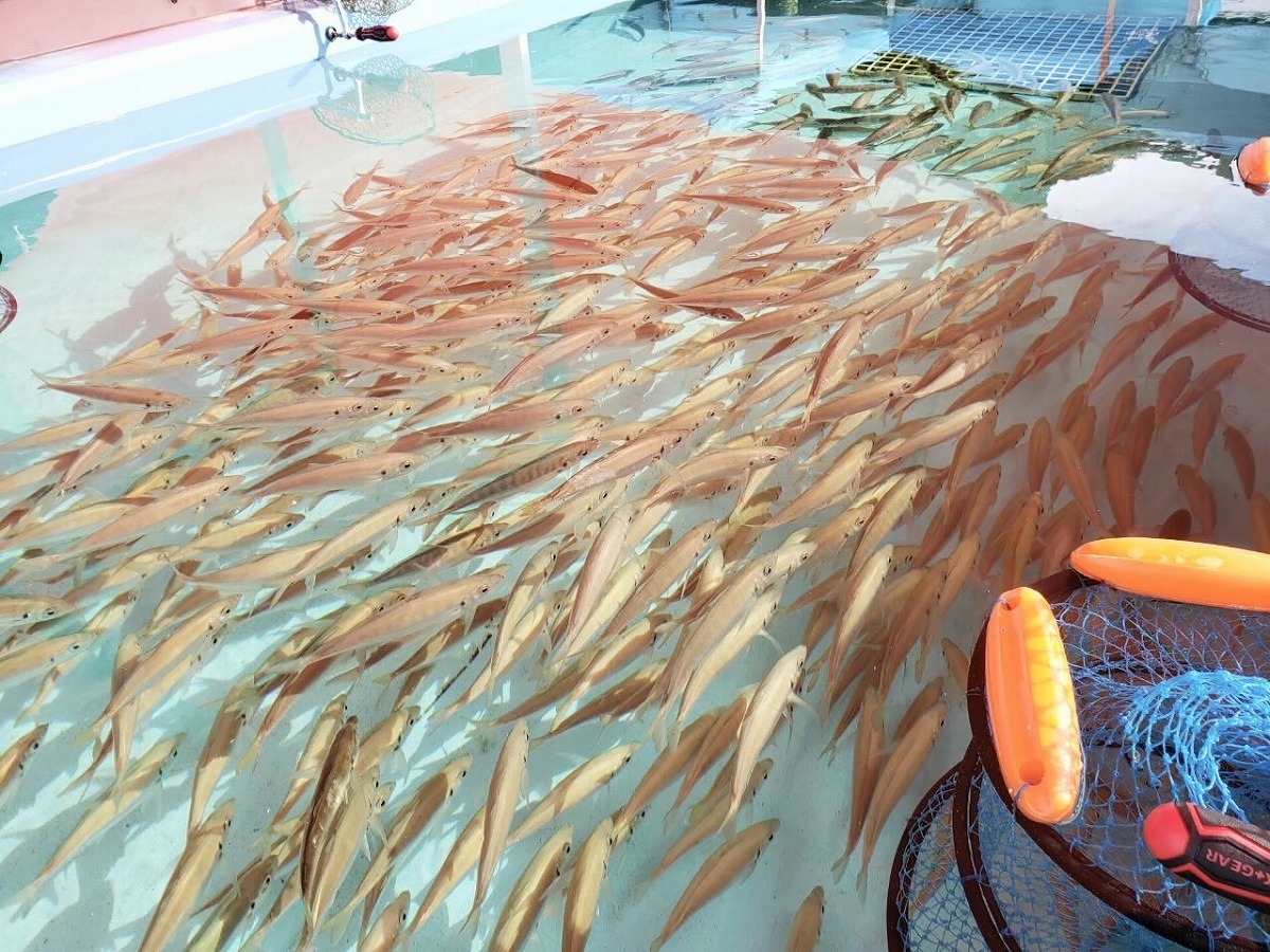 一番のお楽しみがアジの釣り堀体験(1人1200円)。大きな水槽の中では、アジが元気いっぱいに泳いでいます。