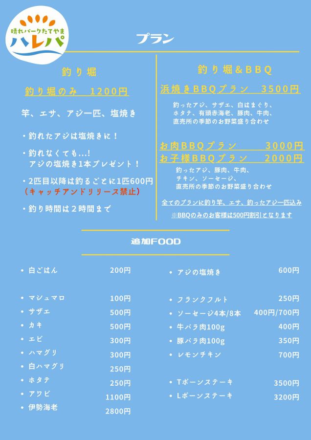 アジの釣り堀体験とBBQがセットになったプランもあります。魚介類が付く「浜焼きBBQプラン」(3500円)と「お肉BBQプラン」(3000円)や、子ども用のBBQプラン(2000円)も!さまざまなプランがあるので、用途や食べたい食材に合わせて選んでみて。
