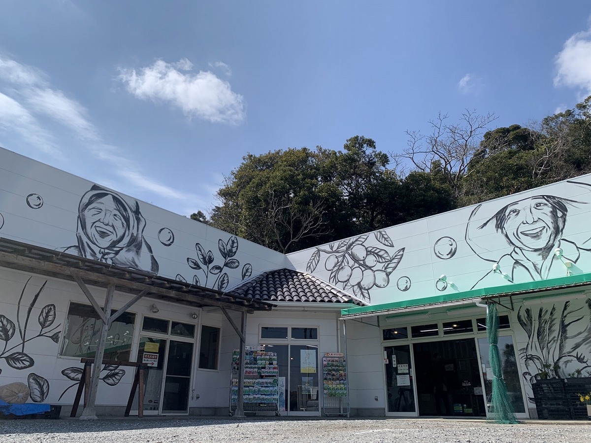 やさしい農家さんのイラストが目を引く建物は、農産物などの直売所。