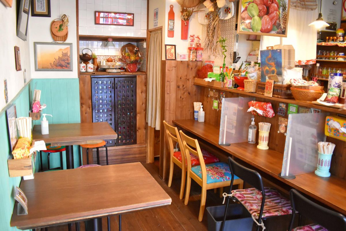 台湾の伝統的な客家花布(はっかはなぬの=牡丹の花模様が描かれた鮮やかな布地)を使用した、かわいい小物もいたるところに散りばめられているなど、まるで現地のカフェにいるような気分に浸れる内装が、とにかくステキなんです♪