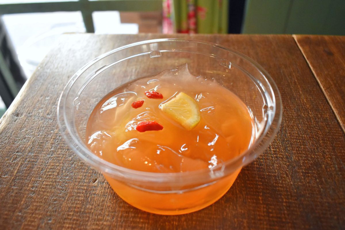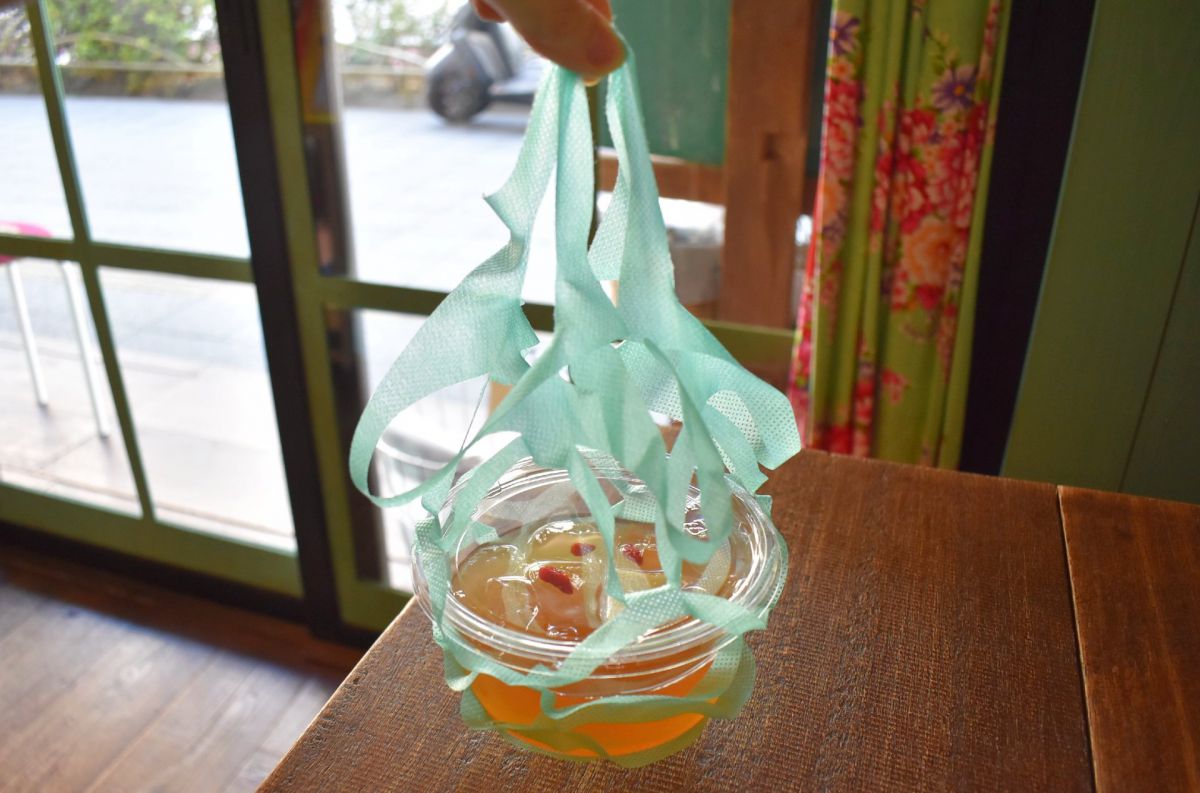 「家豆花」のメニューは、すべてテイクアウトOK。持ち運びやすいよう、レトロなテイクアウト用の手提げに入れてくれるので、思わず写真に収めたくなってしまいます! こちらは、台湾の屋台でおなじみのさっぱりスイーツ「愛玉」500円。