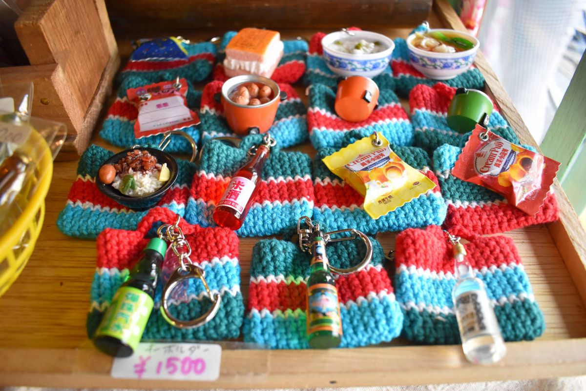 台湾でおなじみのナイロンバッグをモチーフにした「キーホルダー」1500円は、山岡さんたちが一つずつ手編みで手作りしているというオリジナル商品。それぞれに台湾グルメや電気鍋などのミニチュアパーツがついていて、独特のセンスが光ります。