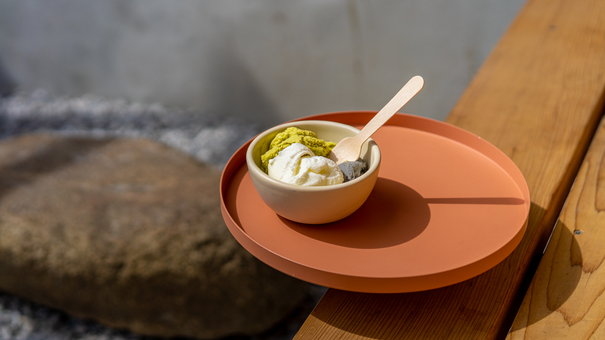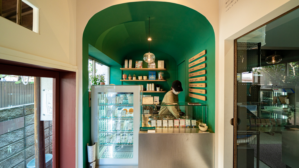 もともとお風呂だった場所は「asatteのジェラート」という販売所になっています。味は「フレッシュミルク」、「黒ごまジンジャー」、「ピスタチオ」、「ショコラ」といったスタンダードフレーバーのほか、季節の食材を生かしたシーズナルフレーバーがあり、毎日店頭に並ぶのは8〜9種類ほど。