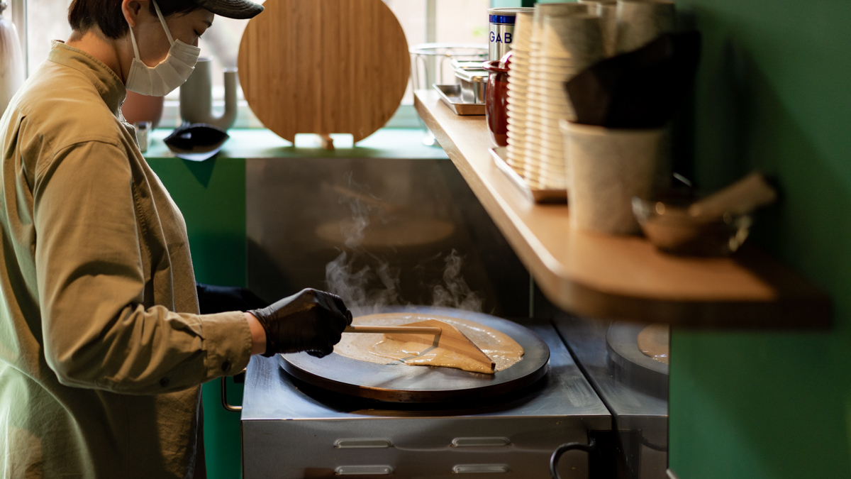 北海道産の全粒粉を使用した「クレープ」440円も販売中。味付けはシュガーバター、黒糖バター、シナモンシュガーバターの3種類。全粒粉のよさを生かすため、シンプルかつ丁寧に焼き上げたクレープは、パリッと香ばしく、適度に心地よい弾力も楽しめますよ♪