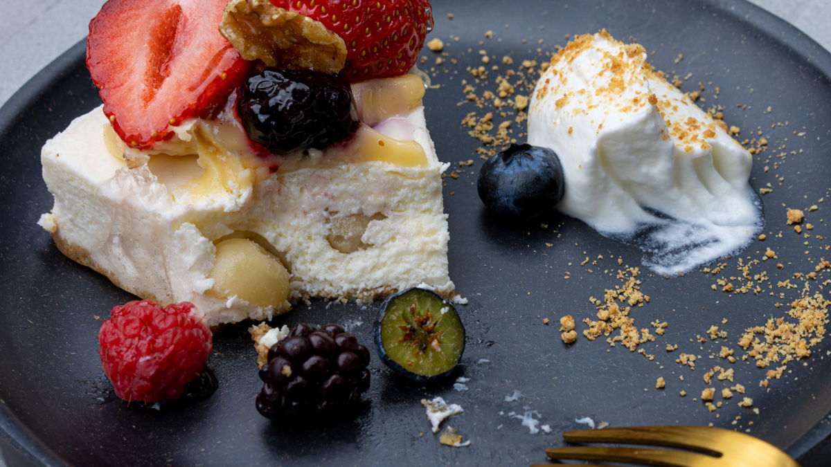 生地の中にマカデミアナッツが隠れているなど、サプライズ的なおもしろさも。チーズケーキという舞台でフルーツやナッツが舞い踊るような、ストーリーを感じるひと皿に仕上がっています。