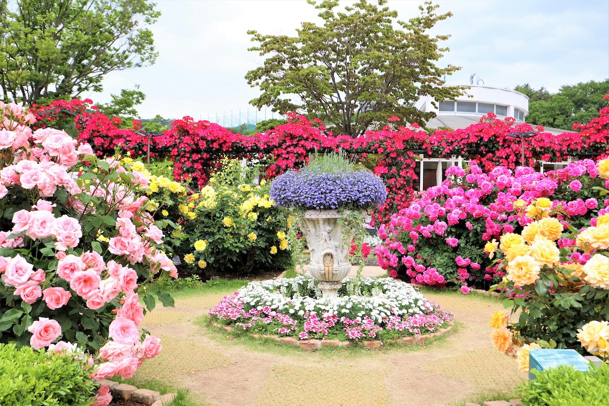 園内には約2200品種、2800株以上のバラが植えられていて、春から秋まで楽しむことができます。なかでも、5月ころに見ごろを迎えるローズトンネルは圧巻!まるで夢の世界へ迷い込んだかのような美しい光景と気品ある香りに、思わずうっとり……。