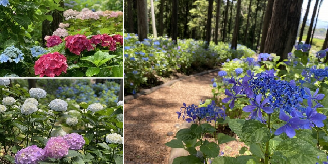 青や紫だけでなく、ピンクや白など色とりどりのアジサイが楽しめます。SNS映えしそうな写真を撮影して、自然とリフレッシュもいいですね。