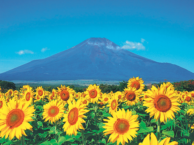 約30万㎡という広大な花畑越しに富士の姿を見ることができる絶景スポット。雄大な富士山をバックに、鮮やかな黄色のひまわりが咲き誇る風景は圧巻です。