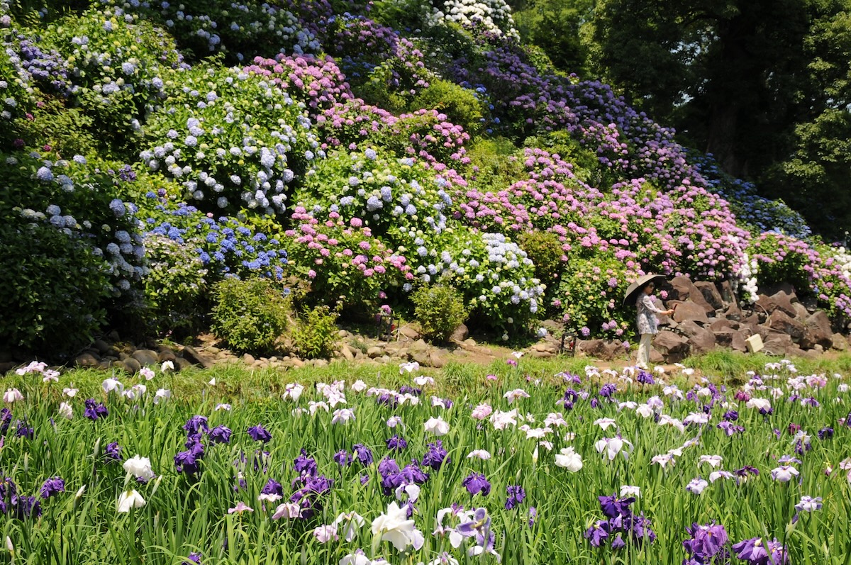 白、紫、斑入りなど、凛とした気品あるただずまいのハナショウブの背景に、白、青、ピンクなど、色鮮やかに咲き誇るアジサイを同時に楽しむことができます。2つの花の競演は見ごたえありですよ!