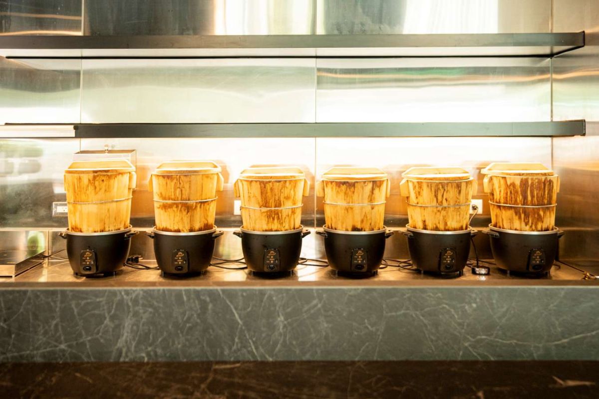 その後、木桶に移して電鍋へ。にがりを入れるタイミングや温度がおいしさの鍵。研究に研究を重ねて編み出しました。並べられた6つの木桶はところどころ変色しています。それはまるでバナナのシュガースポットのように、おいしさの証となっています。