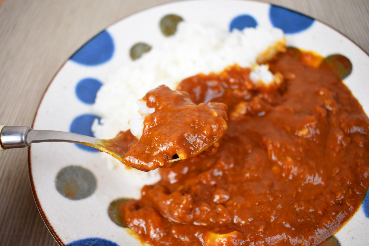 ひと口食べた瞬間、まず感じるのはトマトの濃厚な酸味と旨み。炒めタマネギの甘みや、クリームのまろやかさもうまく調和していて、小さな子どもでも食べやすそうな、やさしい口当たりです。パッケージの辛さ表示は5段階中の「2」なので、辛すぎるカレーが苦手な人にもおすすめですよ♪