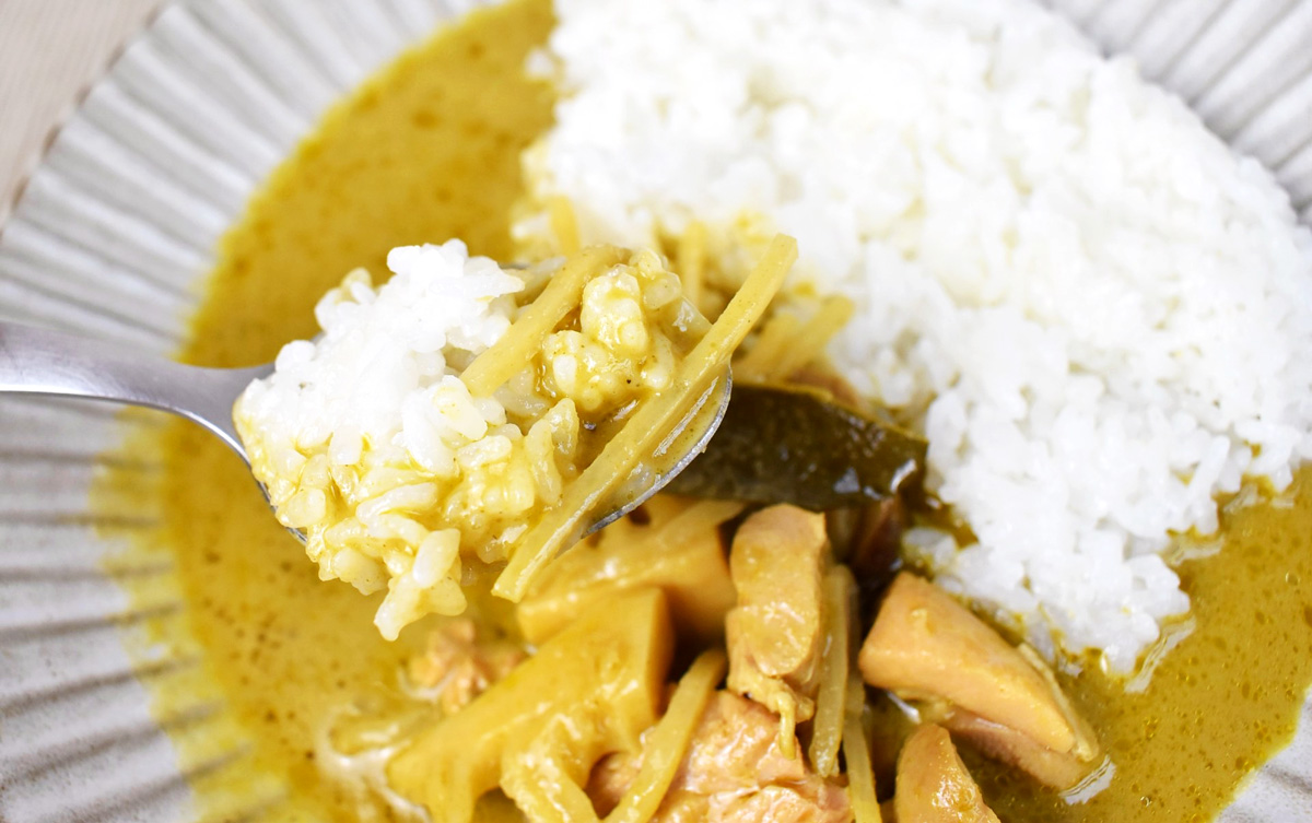 しっとりやわらかい鶏肉や、シャキシャキとしたタケノコの歯ごたえ、プリッとしたフクロタケの食感もよく、レトルトなのにタイ料理店にも引けを取らないおいしさに驚きますよ。