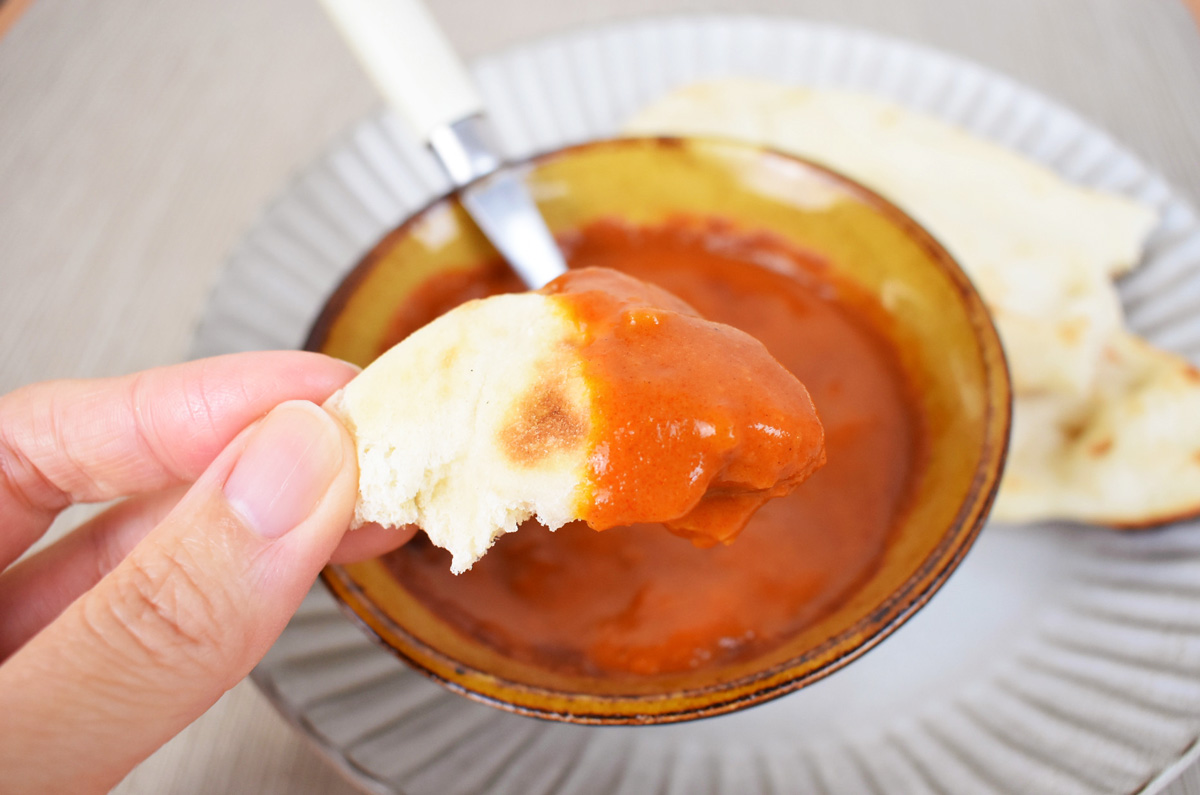ナンはふんわり、しっとり、小麦の風味のなかに甘みも感じられて、カレーのマイルドな辛さと好相性です。今回はナンを用意しましたが、ルウはインド料理店で食べるような、バターたっぷりのものとは違ってアッサリしているので、日本のごはんにもよく合いそうだと感じました!