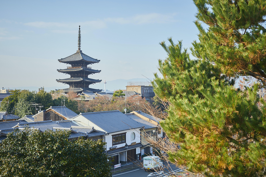 「茶筅 French cafe CHASEN 高台寺」からの眺望がこちら。清水寺を訪れる人が必ず写真に収めるランドマーク・八坂の塔を、邪魔をするものなく、くっきりと見ることができます。