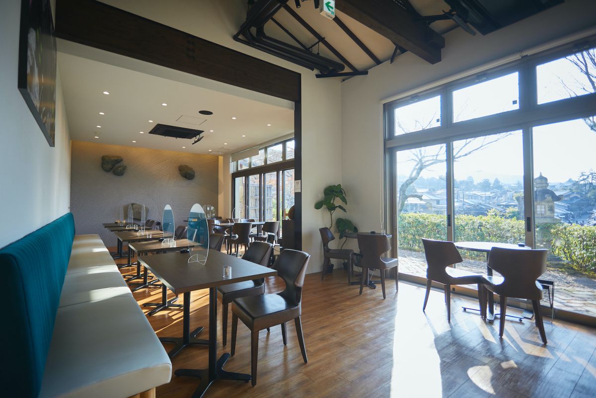 店に一歩足を踏み入れると、清水寺のある東側の壁は、景色がよく見えるように全面が大きな窓に。奥の壁は、デコラティブペインティングによる枯山水庭園のアートになっています。