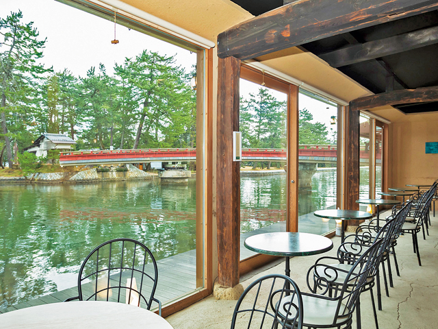 「Cafe du Pin 千歳 chitose」は、天橋立と文殊堂のある陸地を結ぶ廻旋橋のそばにある絶景カフェ。海側は一面ガラス張りになっていて、廻旋橋や天橋立の松並木を間近に眺めることができます。カフェタイムのおすすめは、こだわりのコーヒーと自家製のケーキ。とくに丹波産の黒豆をふんだんに使ったタルトは自慢の一品です。廻旋橋を眺めながら、のんびりとコーヒータイムを楽しみましょう。