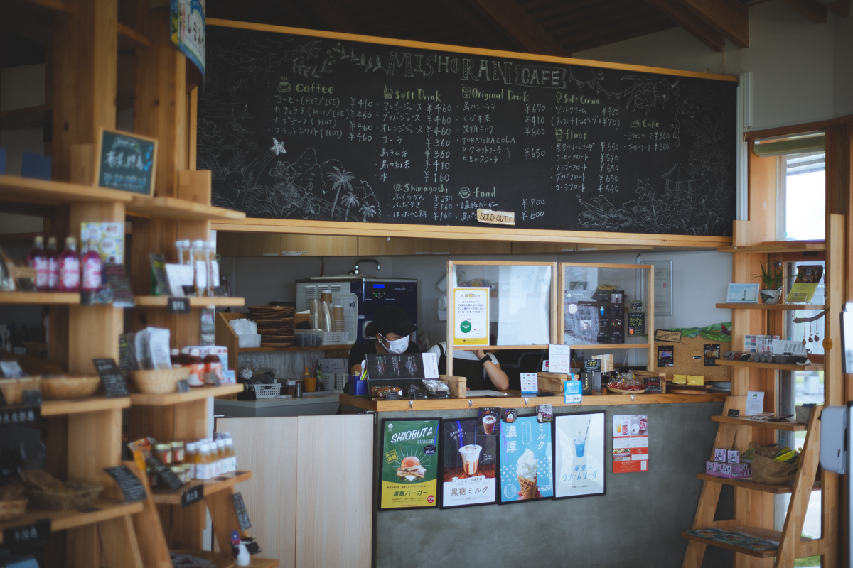 公園内にある、あやまる岬の観光案内所としても運営されている「MISHORAN CAFE(ミショラン カフェ)」は、一面ガラス張りの展望カフェになっていて、ドリンクや軽食、奄美群島のお土産が揃っています。