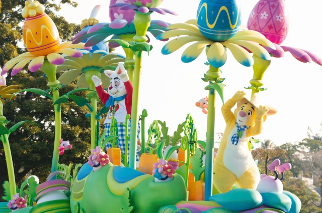 こちらに乗るのはディズニーのウサギのキャラクターたち。プーさんに登場するラビット、不思議の国のアリスの白うさぎ、バンビのミス・バニーの3人。イースターならではのフロートです。