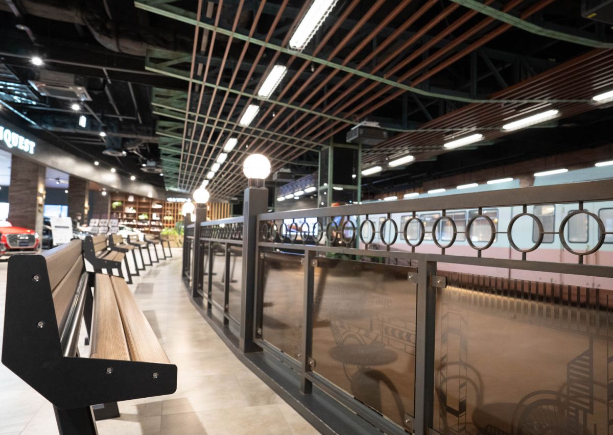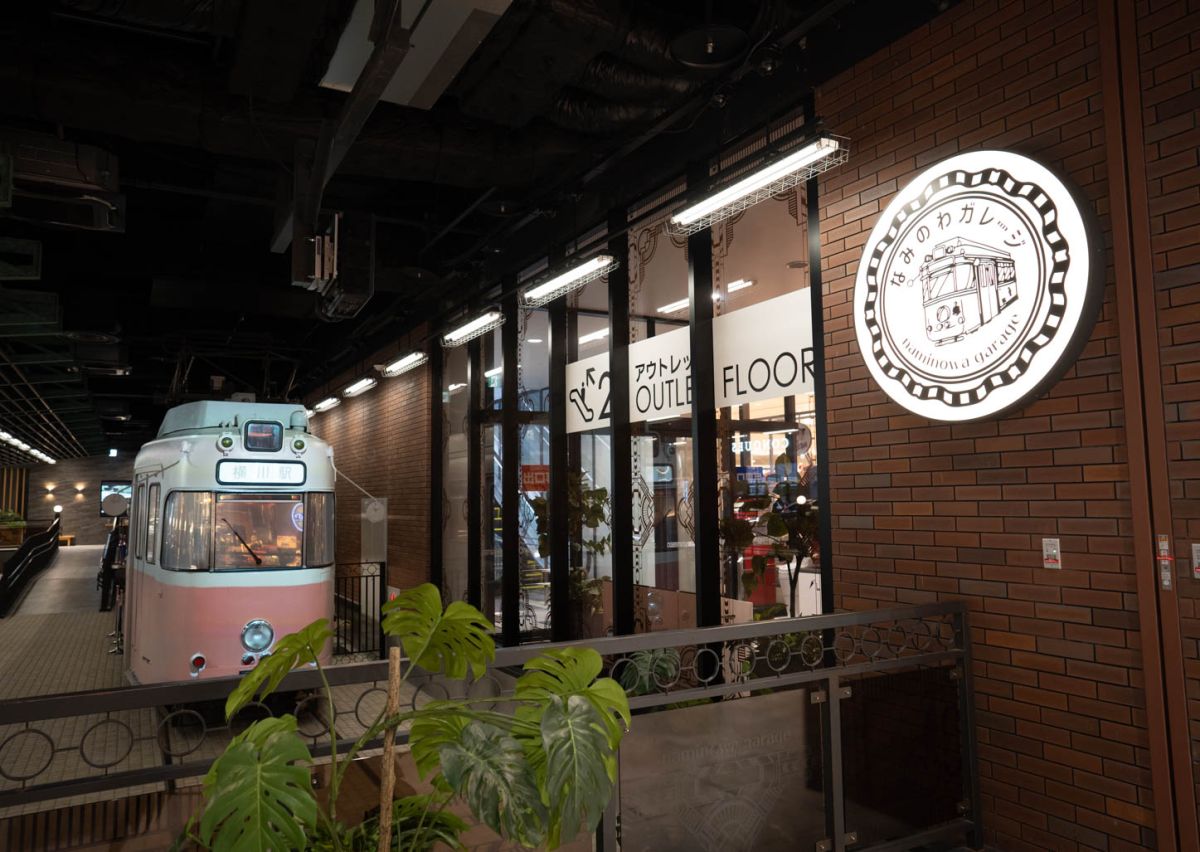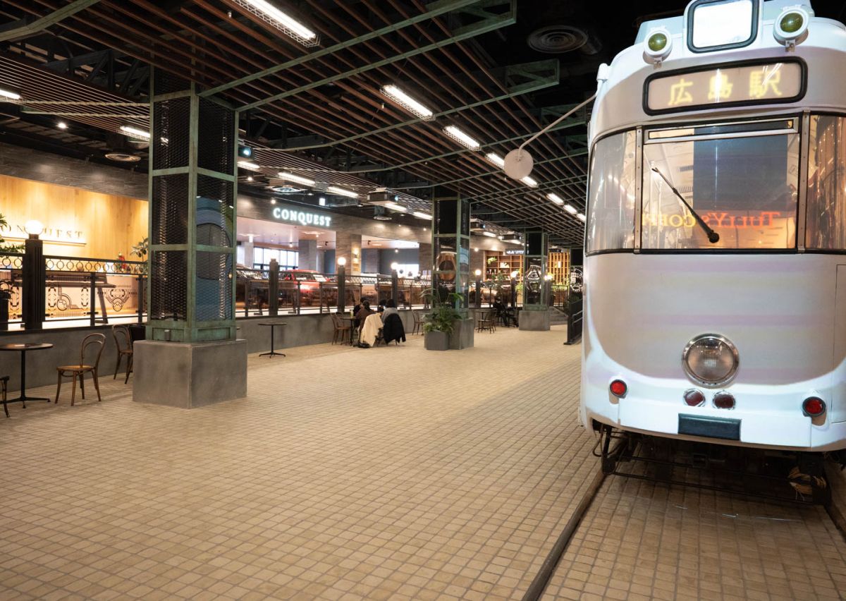 「なみのわガレージ」の中にある「広島電鉄 70系電車」が展示されている周りに、休憩のできるスポットがあります。広島電鉄は、1983~2008年まで実際に運転されていた車両です。電車が醸し出すレトロな雰囲気がたまらないですね!